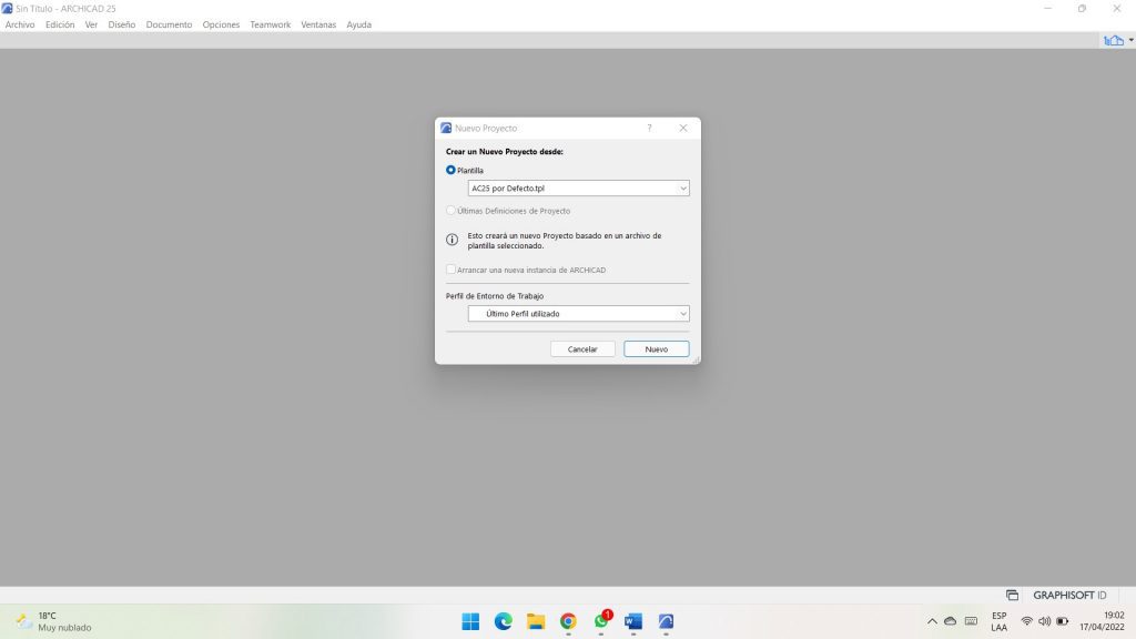 Entonces, ya teniendo un panorama general de la secuencia de trabajo en ArchiCAD, vamos a iniciar explicando acerca de algunos datos importantes al iniciar un proyecto. En primer lugar, al abrir el software y generar un archivo nuevo, vamos a poder escoger una plantilla que va a ser la base para empezar nuestro proyecto, donde vamos a poder tener favoritos de herramientas ya configuradas, combinaciones de capas, plumas, entre otros; a partir del cual nosotros vamos a ir personalizándolo de acuerdo a lo requerido por nuestro proyecto u oficina. Adicionalmente, vamos a poder seleccionar un perfil de entorno de trabajo, donde vamos a tener un perfil de Arquitectura, Mep, Estructuras y posteriormente vamos a poder generar también uno personalizado.