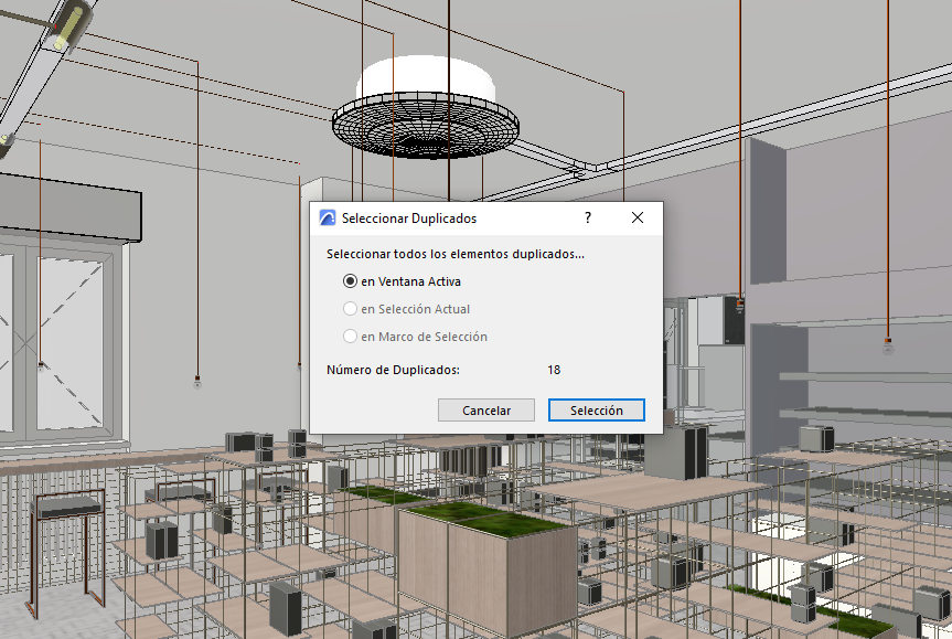 Este complemento de Archicad puede encontrar, seleccionar y eliminar elementos que comparten los mismos parámetros (tipo, color, grosor, altura, etc.) y que ocupan el mismo lugar en el plano de planta.