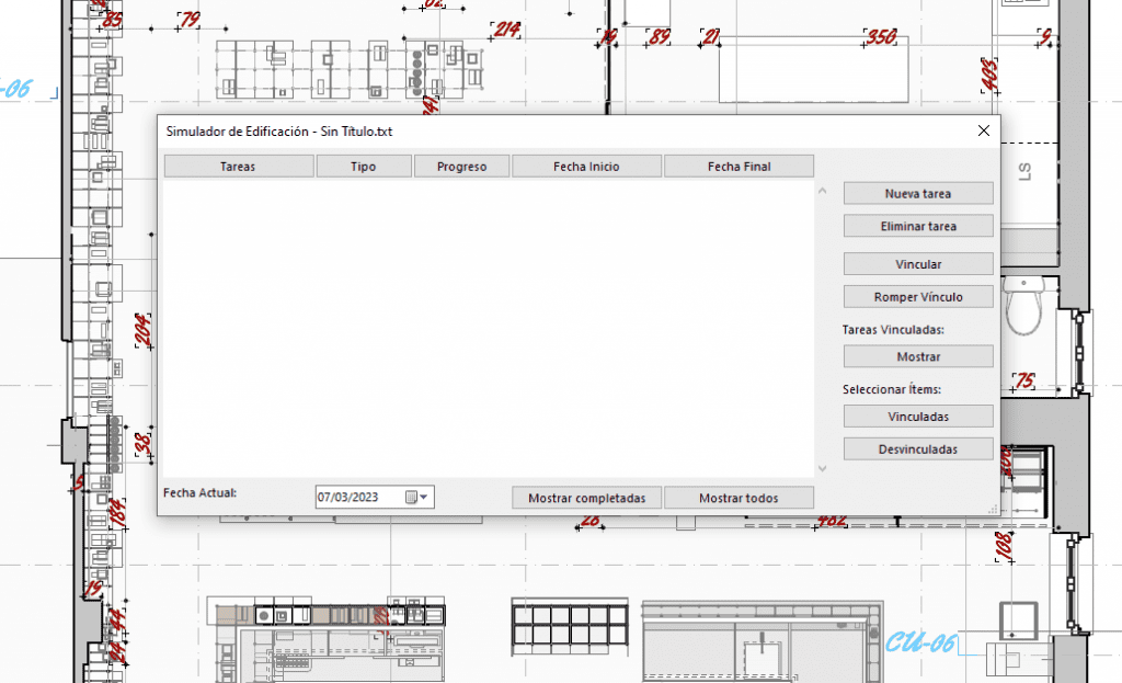 Esta herramienta permite simular el proceso de construcción con el modelo 3D de Archicad mediante la asociación de elementos de construcción a una lista de tareas. Esta lista puede crearse dentro de Archicad o (solo en Windows) importarse desde una base de datos de Microsoft Project. Esta función solo se encuentra activa cuando el plano de Planta está activo.