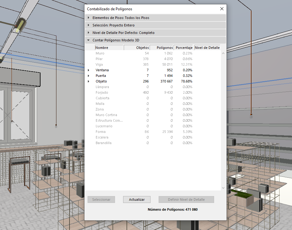 Esta función permite poder tener un control de la cantidad de polígonos 3D permitiendo optimizar los modelos de ArchiCAD según las necesidades. Esta herramienta se puede usar de manera efectiva si el tamaño del proyecto o la memoria física limitada de tu computadora hacen que el tamaño del modelo 3D sea un factor crítico en sus decisiones de modelado.