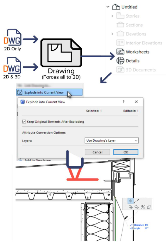 Con esta técnica, el objetivo es cortar intencionalmente la conexión con el dibujo DWG, explotarlo en líneas, rellenos y texto para hacerlo editable. Este es un método para seguir trabajando en el contenido recibido del formato DWG.
