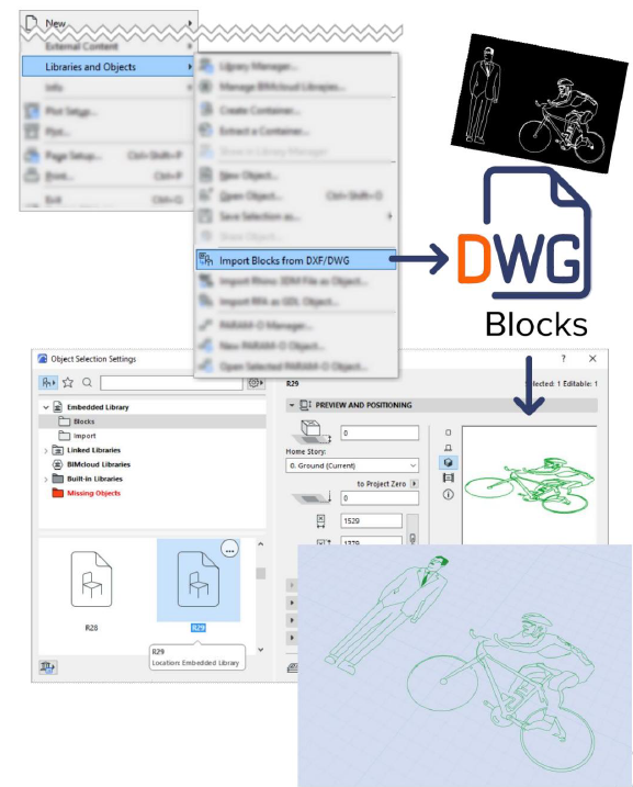 Con este flujo de trabajo, la intención es reutilizar una biblioteca de bloques DWG guardada en un archivo DWG. La técnica en sí convierte los bloques DWG nativos en objetos planos de Archicad, que se componen de líneas 2D en el plano XY y son visibles como líneas en el espacio 3D. Los usos comunes de este flujo de trabajo van desde recopilar bloques para componer o agregar una nueva biblioteca Archicad de proyecto para minimizar la cantidad de contenido repetitivo.